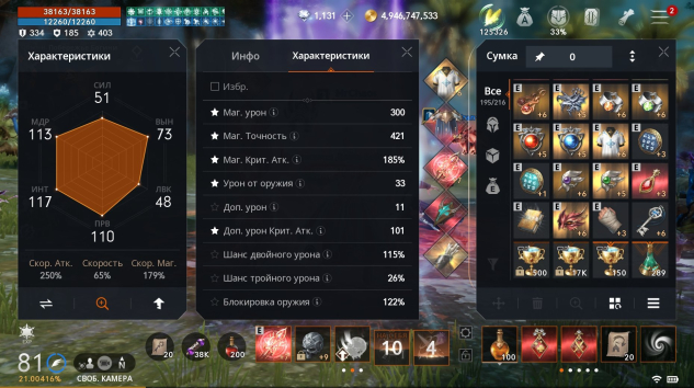 ℹ️ Другие Характеристики: Крит. Атк. 196%, Шанс Двойного Урона 115%, Шанс Тройного Урона 31%, Блокировка Оружия 122%, Увеличение Урона от Оружия 248%, Увеличение Урона от Умений 321%, Сопротивление Оглушению 102%, Шанс оглушения 88%.