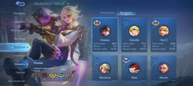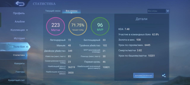 — общее: 71% побед, KDA 7.48, участие в команде 62%;
