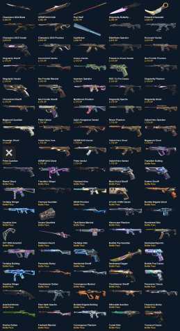 Champions 2024 Blade, XERØFANG Knife, Ruyi Staff, Singularity Butterfly Knife, Prime//2.0 Karambit, Champions 2023 Vandal, Champions 2024 Phantom, Equilibrium, Elderflame Operator, Kuronami Vandal, Singularity Sheriff, ChronoVoid Vandal, Araxys Vandal, Prelude to Chaos Vandal, Neo Frontier Phantom, Singularity Vandal, Neo Frontier Marshal, Imperium Operator, RGX 11z Pro Classic, Singularity Phantom, ChronoVoid Sheriff, Neo Frontier Sheriff, Mystbloom Phantom, Singularity Spectre, Singularity Ghost, Magepunk Guardian, Prime Classic, Gaia's Vengeance Vandal, Recon Phantom, Valiant Hero Operator, Sovereign Ghost, Valiant Hero Ares, XERØFANG Vandal, Valiant Hero Ghost, Magepunk Ghost, Prime Guardian, XERØFANG Ghost, Prime Vandal, Valiant Hero Vandal, Transition Bulldog, Reaver Ghost, Transition Stinger, Yoonseul Ares, Moon Scout Sheriff, Solarex Sheriff, TactiplayStinger, Yoonseul Guardian, RDVR Phantom, ATLAS // CMD Classic, Bumble Brigade Ghost, Aquatica Ares, Arcane Gauntlets, Tacti-Series Marshal, Hieroscape Phantom, Nanobreak Odin, VCT 2025 Karambit, Shellspire Sword, Tactiplay Odin, Bubble Pop Guardian, Sandswept Spectre, Tactiplay Bulldog, Panoramic Bucky, Nanobreak Sheriff, Sandswept Dagger, Bubble Pop Classic, Aquatica Stinger, Cloudweaver Outlaw, Convergence Marshal, Cloudweaver Sheriff, Panoramic Classic, Guardrail Shorty, Fiber Optic Spectre, Bumble Brigade Bulldog, Silhouette Guardian, Frequency Bucky, Overlay Outlaw, Freehand Marshal, Convergence Phantom, Comet Odin, Yoonseul Classic, Bulletbox Bucky, Torque Classic, Tacti-Series Classic, Bumble Brigade Judge, Guardrail Guardian, Cloudweaver Shorty, Silhouette Frenzy, Torque Spectre, Arcane Vandal, Fiber Optic Ghost, Guardrail Vandal, Transition Knife, Nanobreak Judge, Torque Operator, Overlay Dagger, Retrowave Operator, Bulletbox Guardian, Sandswept Vandal, Cloudweaver Stinger, Celestia Operator, Overlay Sheriff, Silhouette Judge, Tacti-Series Frenzy, Convergence Stinger, Tacti-Series Guardian, Libretto Ghost, Aquatica Outlaw, Moon Scout Guardian, Freehand Spectre, Moon Scout Bucky, Transition Shorty, Aquatica Shorty, Byteshift Ghost, Convergence Frenzy, Bumble Brigade Ares, Libretto Stinger, Torque Vandal, Comet Spectre, Retrowave Bulldog, Fiber Optic Classic, Overlay Stinger,