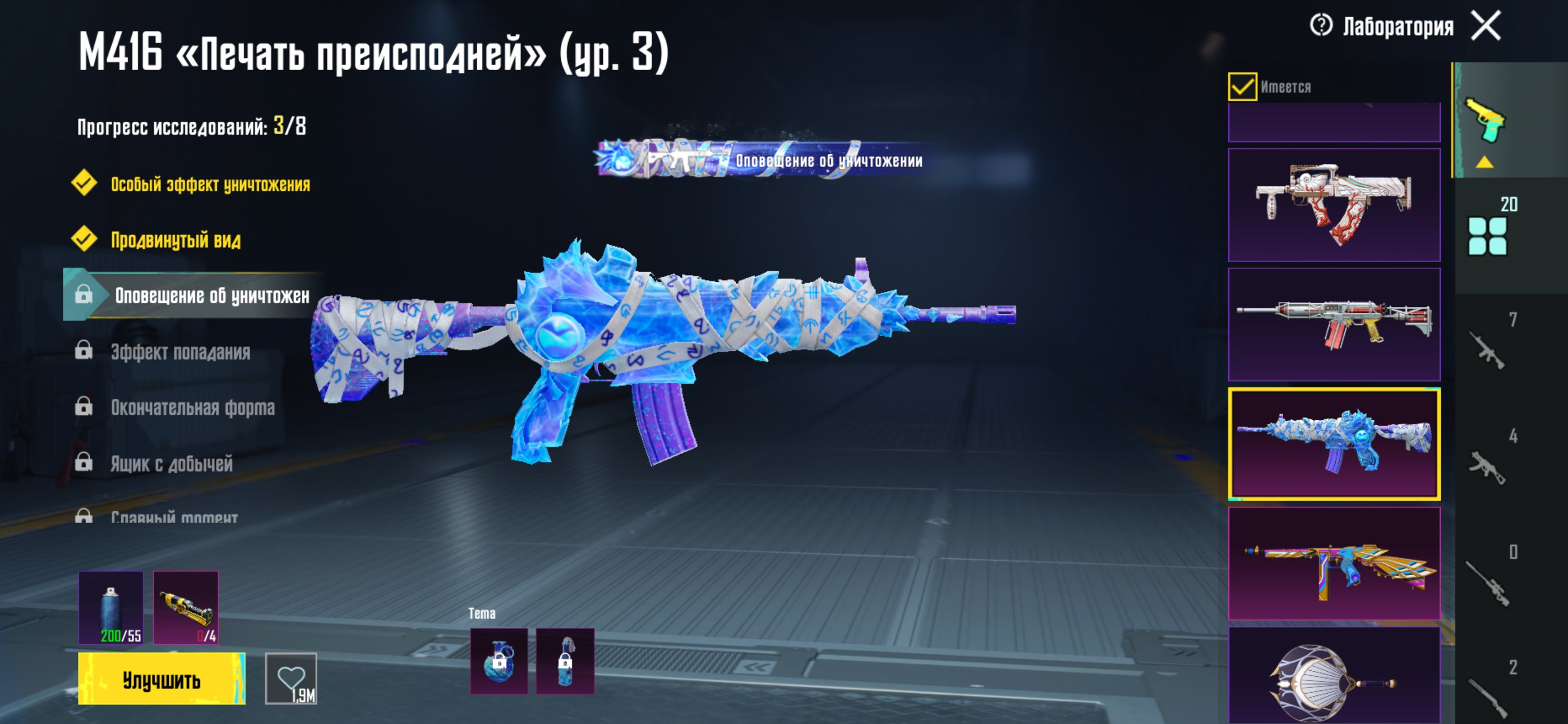 М416 печать преисподней 3ур, гроза огненный годзила 2ур, ump45 опустошитель душ 4 ур, p90 золотой коготь 4 ур, Uzi пылающие оковы 1ур, и т.д в фотографиях.