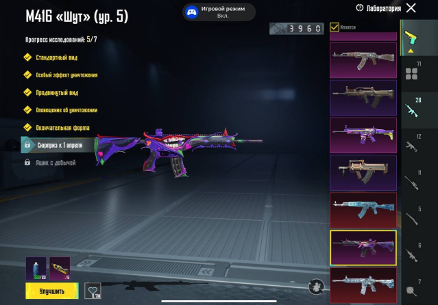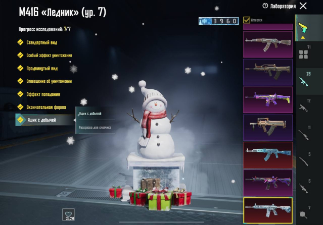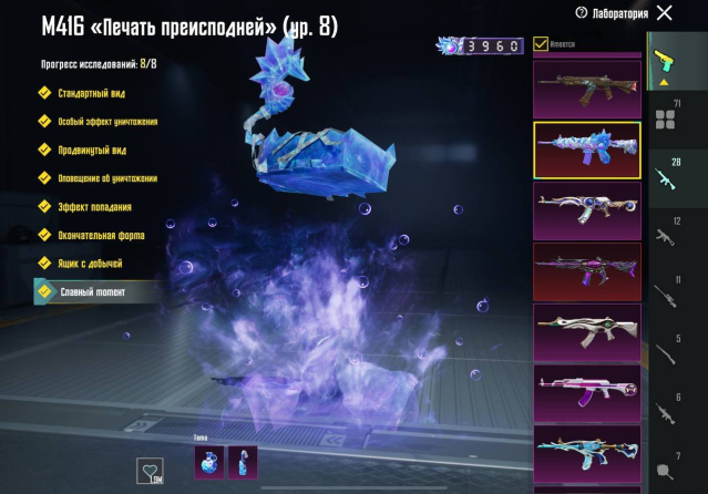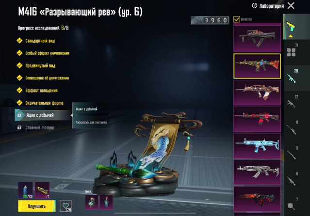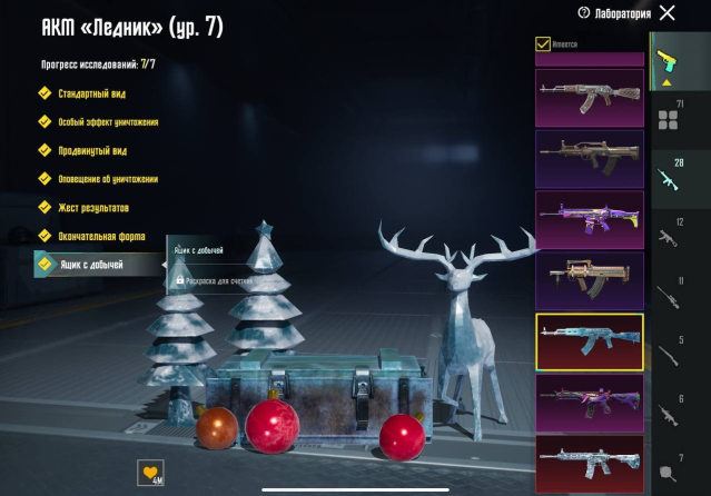 💥 M416 «Печать преисподней» Уровень 8 → M416 «Ледник» Уровень 7 → M416 «Божество ниндзя» Уровень 7 → АКМ «Ледник» Уровень 7 → UMP45 «Морозный иней» Уровень 7 → M416 «Разрывающий рёв» Уровень 6 → M416 «Шут» Уровень 5 → M416 «Охваченный приливом» Уровень 5 → AUG «Ужас морских глубин» Уровень 5 → UMP45 «Опустошитель душ» Уровень 5 → M24 «Острие прогресса» Уровень 5 → DBS «Космозверь» Уровень 5 → М762 «Безудержный бунт» Уровень 4 → AUG «Рев бездны» Уровень 4 → М762 «Платиновый скелет» Уровень 4 → SCAR-L «Сказочное королевство» Уровень 4 → P90 «Золотой коготь» Уровень 4 → S12K «Атомный триггер» Уровень 4