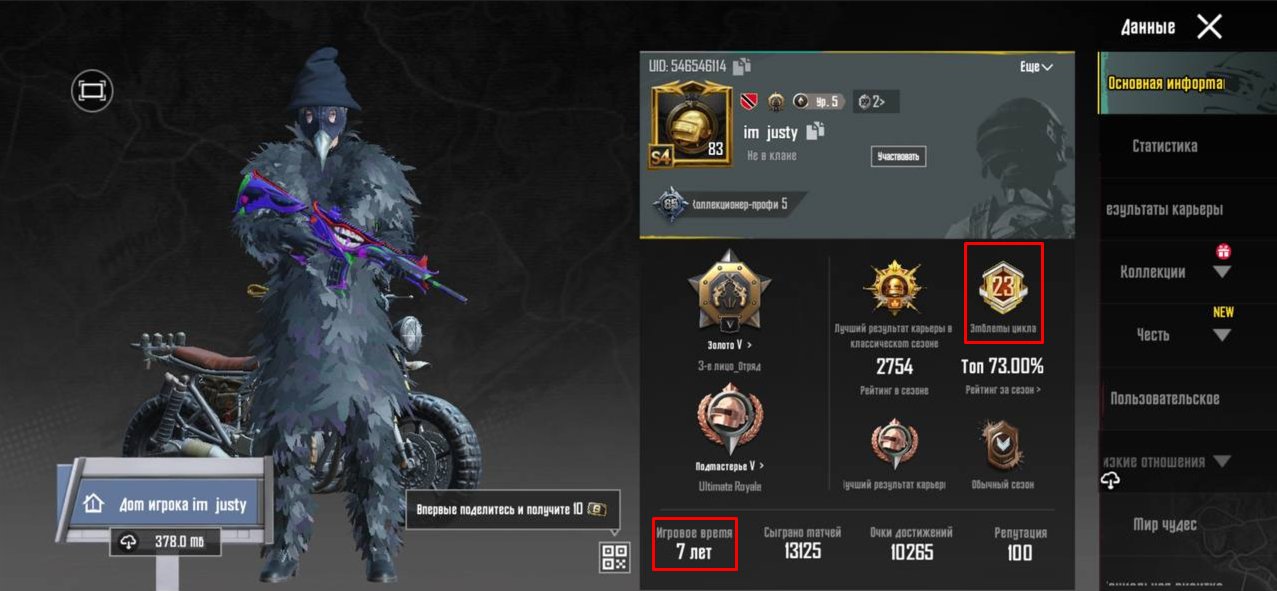 Подробное описание: ℹ️Информация об аккаунте: OLD Аккаунт с 1-го сезона, 23 Завоевателя, 22 Прокачиваемых оружий, M416 Шут(ур. 7), 2 Мумии, Количество скинов(1 — Золотой, 85 — Мифических, 650 — Легендарных, 893 — Фиолетовых), Титулов 62 шт.(Следователь-майор, Мастер арены, Мифическая мода, Стеклянная пушка, Берсерк S1 Metro, Шесть вех, Уникальная судьба, Вечный ученик, Гроза врагов), Редкая рамка Завоевателя 4-го сезона, Уровень аккаунта(83), Популярность(1230000, ур. 5), Очков достижений(10265), Прокачанных RP Elite Pass начиная с S4(33 шт.), Именной жетон Завоевателя 8-го сезона(Самый первый), Редкая рамка Завоевателя C1S1, Уровень коллекции(65), Лайков в профиле(10265), Аккаунт 7-летней давности(С релиза игры), Серебра(7500), Сезонных монет(3125), Персонажей(7), Карты для создания лобби(22 шт. — 7 дней, 47 шт. — 1 день, 18 шт. — 1 использование), Хорошее K/D предыдущих сезонов, ID Аккаунта(546546114).