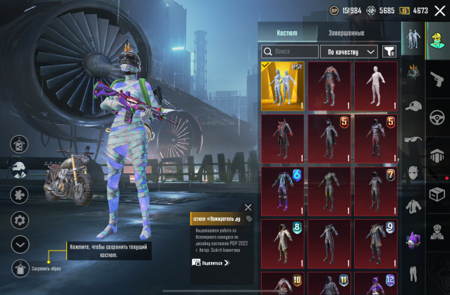 🔫Скины, из редких: M416 Шут(ур. 7), Мумия Пожиратель душ(Золотого качества), Мумия(Белая), Шлем инферно, Vector Золотой граф(ур. 5), M762 8-битный пони(ур. 4), Сковорода Регалии(ур. 3), M416 Ледник(ур. 1), Костюм Ворона, Бандана Гепард(OLD), Фулл Костюм Вампир(OLD), Костюм Скиталец(OLD), Dacia Золотая пасть(OLD), Костюм Вторжение(Мифик), Костюм Дорожный гнев(OLD), Мотоцикл Дэрила(Коллаборация с The Walking Dead), Мифическое лобби «Киберпанк», Самолет «Золотой курок», Вид персонажа(Прическа «Косички», Прическа S5 сезона).