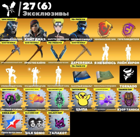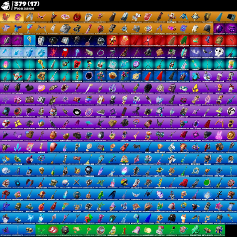 🤹 Скинов: 347 🧳 Рюкзаков: 379 🪓 Кирок: 332 🪩 Эмоций: 259