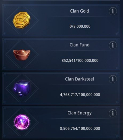 Имеются ресурсы клана в количестве: 850 735 капитал клана, 4 704 215 темной стали клана, 8 441 405 энергии клана.