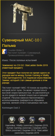 Подробное описание: Продам Сувенирный MAC-10 | Пальма (Чемпионат по CS:GO: StarLadder Berlin 2019 (памятный предмет)) Коллекция Dust 2