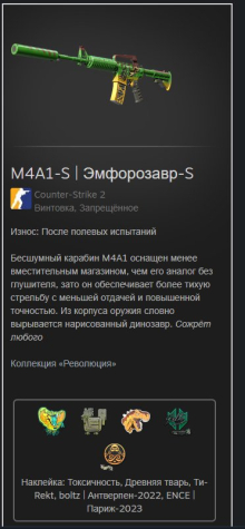 Подробное описание: 💫В продаже «M4A1-S | Эмфорозавр-S» с наклейками: Токсичность, Древняя тварь, Ти-Rekt, boltz | Антверпен-2022, ENCE | Париж-2023