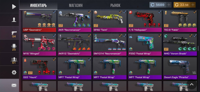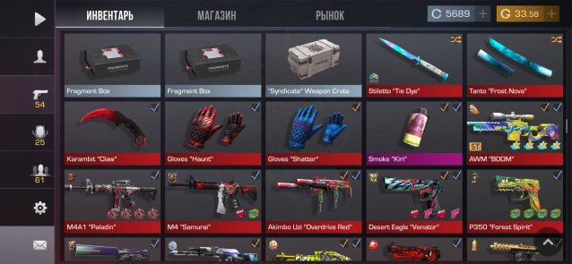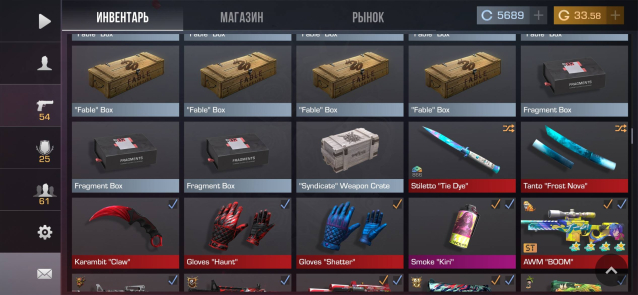 ▪︎ На аккаунте в общей сумме скинов, брелков, наклеек на 30к голды, 3 ножа, 2 перчаток, очень много аркан. Боксов на 5000+ серебра (в том числе среди них много sharp и empire боксов которые продаются только на рынке за голду) и на балансе еще 5.6к.