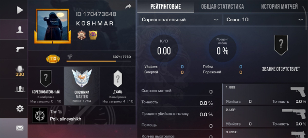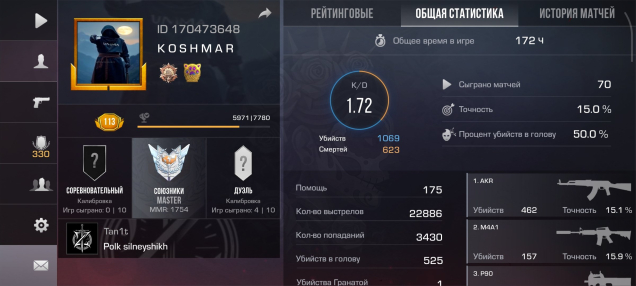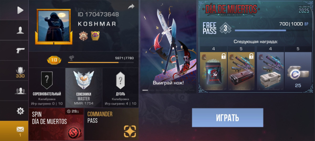 Звание: MasterКраткое описание: АККАУНТЕ ИМЕЕТСЯ НОЖ И ПАРУ СКИНОВ РАНГ МАСТЕР УР 113