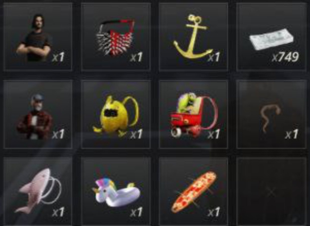 • Инвентарь:🫐♥️Скин «Staff», Аксессуар на лицо «Маска Шипы», Аксессуар в руку «Посох Якорь», Рюкзак «Золотое Яйцо», Рюкзак «Динозаврик», Аксессуар на шею «Змея», Рюкзак «Акула», Аксессуар на пояс «Надувной Единорог», Аксессуар на ТС «Доска для Серфа»🫐♥️