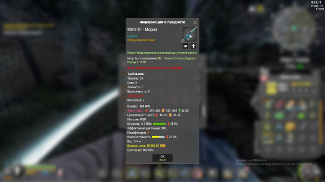 Сервер: RU-2Краткое описание: MSR-10 — мороз м8 (397-664)32.8%урон -45 кучность -25 износ (все сервера)