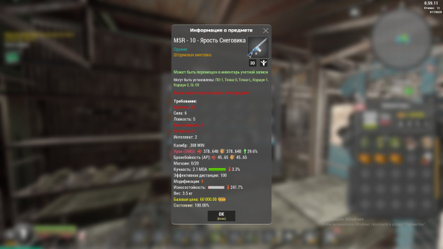 Сервер: RU-1Краткое описание: MSR-10 — ярость снеговика м9 (378-648)29.6%урон -3 кучность -240 износ (все сервера)