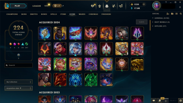 ◾224 TOTAL ICONS OWNED: 147 Rare, 20 Epic, 5 Mythic, 3 Legacy