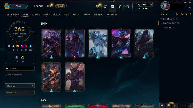 ▪️54 Legendary: Dark Cosmic Jhin, Mecha Kingdoms Jax, Battle Bunny Miss Fortune, Dream Dragon Yasuo, Nightbringer Yasuo, Truth Dragon Yasuo, Battle Academia Ezreal, Porcelain Protector Ezreal, Inkshadow Master Yi, Star Guardian Akali, God-King Darius, Coven Morgana, Spirit Blossom Sett, Dawnbringer Yone, Battle Academia Caitlyn, Pulsefire Caityn, Sentinel Vayne, Star Guardian Xayah, Demonblade Tryndamere, Battle Queen Katarina, Debonair Zed, Galaxy Slayer Zed, Spirit Blossom Ahri, Star Guardian Ahri, Coven Evelynn, Soul Fighter Viego, Broken Covenant Riven, Mythmaker Irelia, Nunu & Willump Bot, Empyrean Pyke, God Fist Lee Sin, Storm Dragon Lee Sin, High Noon Lucian, Star Guardian Kai'sa, Cosmic Lux, Dark Cosmic Lux, Winterblessed Diana, The Magnificent Twisted Fate, Sentinel Graves, Solar Eclipse Sivir, Forecast Janna, Space Groove Blitz & Crank, Space Groove Teemo, Primetime Draven, True Damage Ekko, Corporate Mundo, High Noon Leona, Lunar Eclipse Leona, Solar Eclipse Leona, Spirit Blossom Thresh, Dawnbringer Soraka, Nightbringer Soraka, Eternum Nocturne