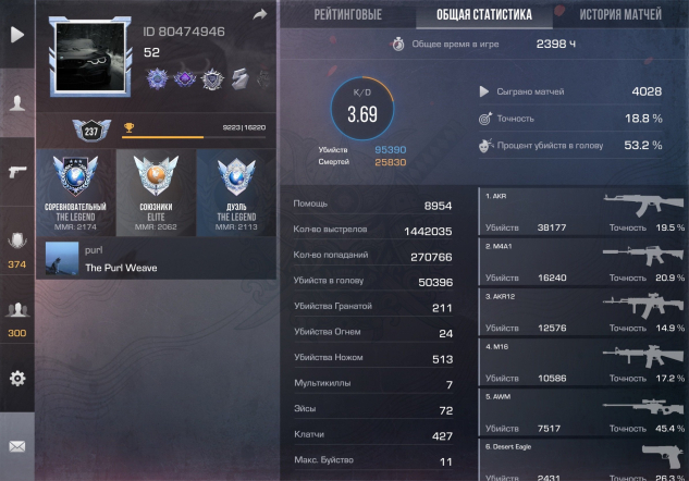 · Внушительная статистика: 2398 часов в игре и KD 3.69.