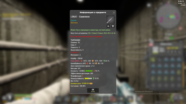 Сервер: RU-2Краткое описание: L96A1 — хамелеон м8 (1072-1597)33.1% урона -76 кучность +10 износ (все сервера)