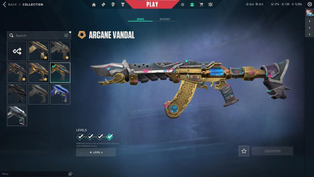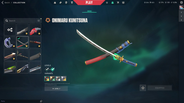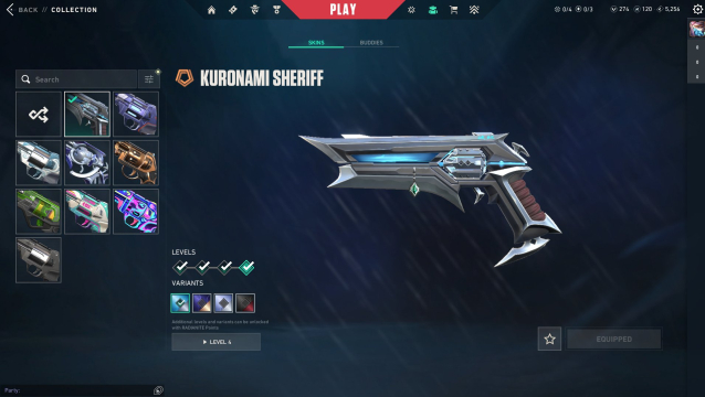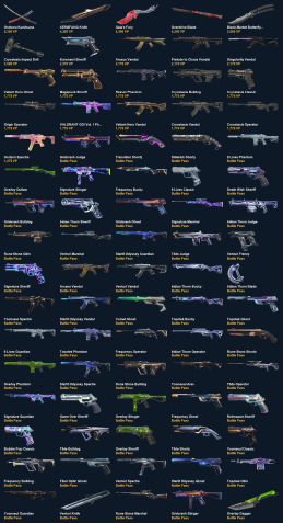 Onimaru Kunitsuna, XERØFANG Knife, Gaia's Fury, Overdrive Blade, Black.Market Butterfly Knife, Cryostasis Impact Drill, Kuronami Sheriff, Araxys Vandal, Prelude to Chaos Vandal, Singularity Vandal, Valiant Hero Ghost, Magepunk Sheriff, Reaver Phantom, Cryostasis Bulldog, Cryostasis Classic, Origin Operator, VALORANT GO! Vol. 1 Phantom, Valiant Hero Vandal, Cryostasis Vandal, Cryostasis Operator, Horizon Spectre, Gridcrash Judge, Transition Shorty, Sidekick Shorty, 9 Lives Phantom, Overlay Outlaw, Signature Stinger, Frequency Bucky, 9 Lives Classic, Death Wish Sheriff, Gridcrash Bulldog, Iridian Thorn Sheriff, Gridcrash Ghost, Signature Marshal, Iridian Thorn Judge, Rune Stone Odin, Venturi Marshal, Starlit Odyssey Guardian, Tilde Judge, Venturi Frenzy, Signature Sheriff, Arcane Vandal, Venturi Vandal, Iridian Thorn Bucky, Iridian Thorn Blade, Yoonseul Spectre, Starlit Odyssey Vandal, Comet Ghost, Topotek Bucky, Topotek Ghost, 9 Lives Guardian, Topotek Phantom, Frequency Operator, Iridian Thorn Operator, Rune Stone Shorty, Overlay Phantom, Starlit Odyssey Spectre, Rune Stone Bulldog, Yoonseul Ares, Tilde Operator, Signature Guardian, Game Over Sheriff, Overlay Stinger, Frequency Ghost, Retrowave Sheriff, Bubble Pop Classic, Tilde Bulldog, Overlay Sheriff, Tilde Shorty, Yoonseul Classic, Frequency Bulldog, Fiber Optic Ghost, Venturi Spectre, Starlit Odyssey Ghost, Topotek Odin, Yoonseul Guardian, Venturi Knife, Rune Stone Marshal, Gridcrash Stinger, Overlay Dagger, 9 Lives Ares, Tilde Knife