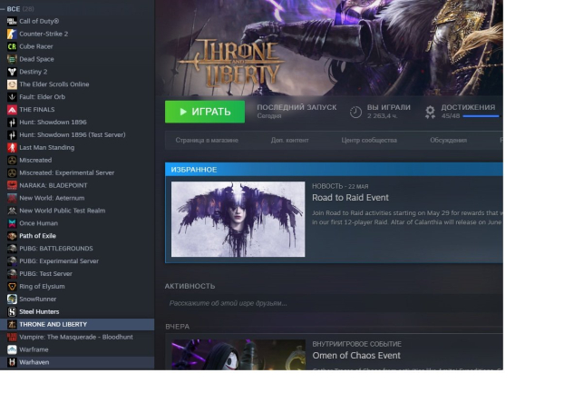 Подробное описание: Продаю личный Steam-аккаунт с Throne and Liberty + New World (+DLC) 6000 часов ≈ 700GS + Hunt: Showdown + The Elder Scrolls Online (+DLC) + SnowRunner