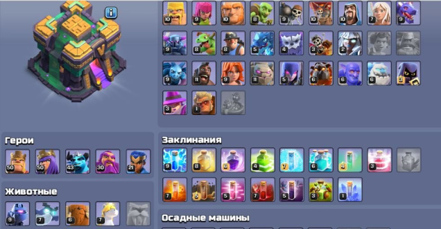 Уровень Ратуши: 14Краткое описание: 🟦💥💥【 TH 14 】⚡️164 LVL ⚡️💠 1348 Гемов 💠【ГЕРОИ — 50|50|43|30|21】⚡️Skins 14+decor 2⚡️🟦💥💥