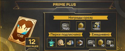 Подробное описание: Подписка «Премиум+» (на 12 месяцев): сразу после активации вы получите 7920 UC, 3600 очков RP и предметы на 17280 UC по внутриигровой почте. Остальные награды забирайте каждый день во вкладке «Спецпредложения» → «Подписки».