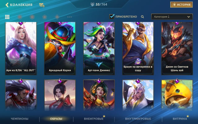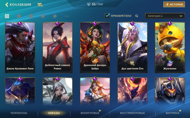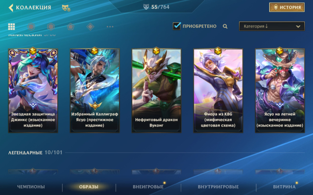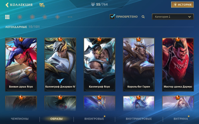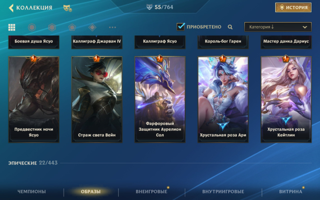 Из гордости аккаунта почти все скины на ясуо (есть престижный каллиграф, престижный летний, обычный каллиграф и другие)