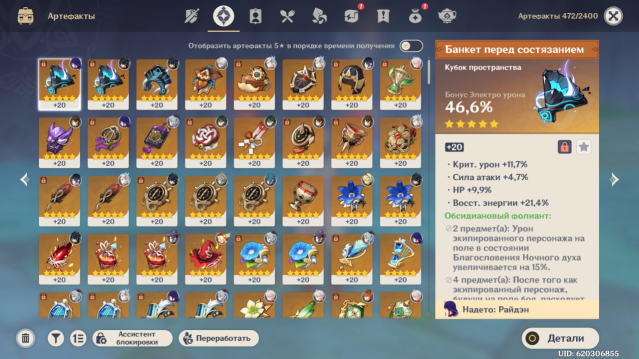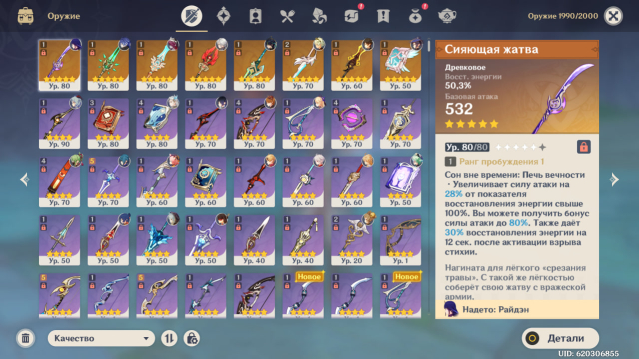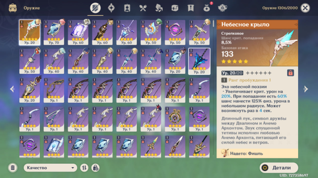 Оружие: Сияющая жатва (сигна Райден), Нефритовый коршун, Небесная ось, Посох Хомы (сигна Ху Тао), Клык Горного короля (сигна Кинича), Меч Сокола R2, Покоритель вихря (сигна Чжун Ли), Небесный атлас.