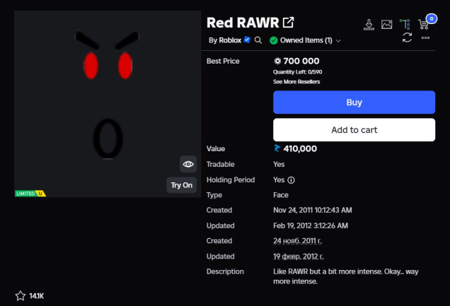 Подробное описание: Вещь в каталоге стоит 700к робуксов, передача происходит через трейд