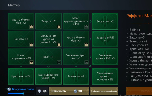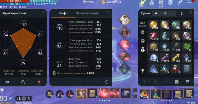 Другие статы: Крит. Атк. 153%, Шанс Двойного Урона 93%, Шанс Тройного Урона 23%, Блокировка Оружия 96%, Увеличение Урона от Оружия 205%, Увеличение Урона от Умений 203%, Сопротивление Оглушению 60%,