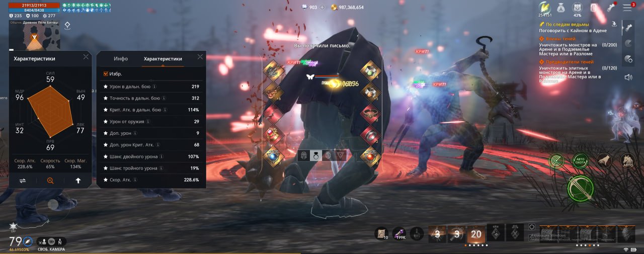 ℹ️ Другие Характеристики: Крит. Атк. 114%, Шанс Двойного Урона 107%, Шанс Тройного Урона 19%, Блокировка Оружия 63%, Увеличение Урона от Оружия 204%, Увеличение Урона от Умений 159%, Сопротивление Оглушению 34%, Шанс оглушения 40%