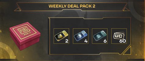 ⚠️ Внимание: это не одноразовая покупка — пак доступен каждую неделю📦 Приобретая Weekly Deal Pack 2, вы получите 60 UC, 2 классических, 4 ящиков снабжения и 6 купонов экипировки.🔁 Доступен раз в неделю, состав фиксированный