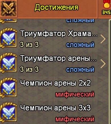 Есть кост за топ1 арены ЯРОСТНЫЙ БЕРСЕРК, а так же две ачивки за топ1 арены. Есть обе книги арены и фулсет 33, а так же сменный 34 пвп-фулсет в сопру