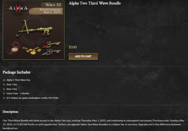 Наш пакет «Третья волна» предоставит доступ ко второму этапу Альфа-тестирования, который начнется в четверг, 1 мая 2025 года, и продолжится на последующих этапах тестирования! Покупка заканчивается во вторник, 27 мая 2025 года, в 11:00 по Тихоокеанскому времени или до тех пор, пока не закончатся запасы. Тестировщики могут в любое время обновить пакеты Alpha Two Wave до более высокого уровня. Стоимость обновления — это разница между ценами на пакеты.