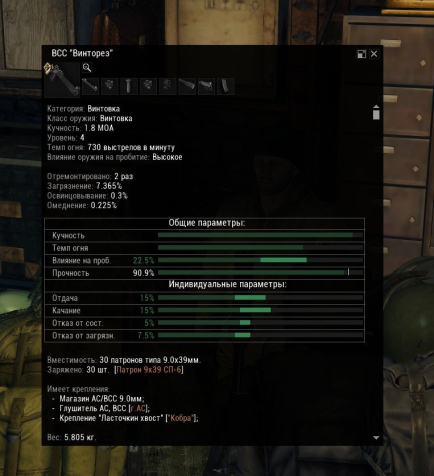 Подробное описание: добрый мод всс: пробитие+22.5%, отдача+15%, качание +15%, отказ от состояния+5%, отказ от загрязнения +7.5%