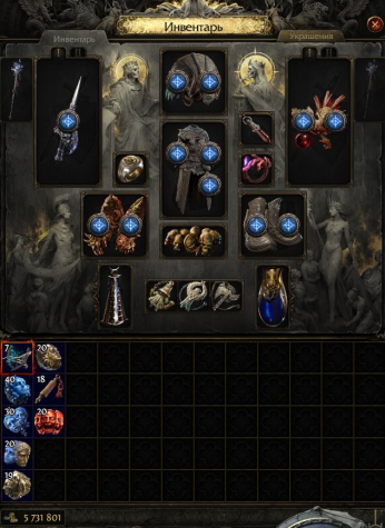 · Секции: Валюта, Путевой камень, Делириум, Сущности, Раны, Камни умений, Ритуал, Флакон-оберег.