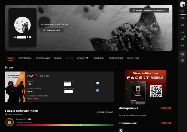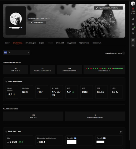 🟣 Faceit: 10 LVL (2090 ELO) | 129 игр | 63% Winrate | 1.27 K/D | 17 Avg | 5 Points