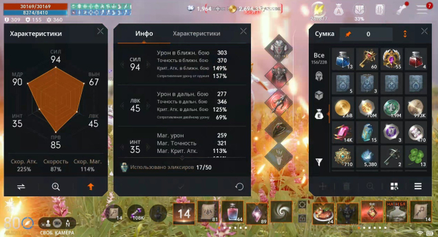 Другие статы: Крит. Атк. 149%, Шанс Двойного Урона 116%, Шанс Тройного Урона 14%, Блокировка Оружия 94%, Увеличение Урона от Оружия 206%, Увеличение Урона от Умений 210%, Сопротивление Оглушению 84%,