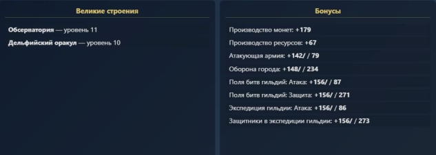 Подробное описание: Миры: 1, Эпоха: Океаническое будущее, Рейтинг: 8900, Бриллианты: 700+, Монеты: 79 000 000, Ресурсы: 25 000 000, Медали: 490 000, Великие строения: Обсерватория (уровень 11), Дельфийский оракул (уровень 10), Бонусы: Производство монет (+179%, Производство ресурсов (+67%, Атакующая армия (+142/79%, Оборона города (+148/234%, Поля битв гильдий: Атака (+156/87%, Поля битв гильдий: Защита (+156/271%, Экспедиция гильдии: Атака (+156/86%, Защитники в экспедиции гильдии (+156/273%