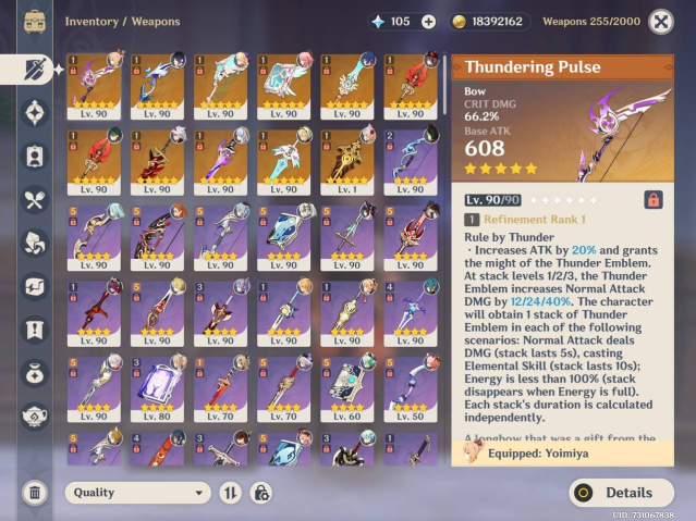 Подробное описание: на 90-м уровне из легендарок полностью собраны на аккаунте: ёимия с сигной, с1 хутао с сигной, кадзуха, итто с сигной, гань юнь, аяка с сигной, с1 яэ мико, нахида, елань с сигной, сяо с хомой, с4 мона, с3 кецин. Также из несобранных персонажей сайно, альхайтам, с2 цици, с2 тигнари, муалани, джин. 18 с6 эпических персонажей (4 из которых прекрасно собраны). По оружиям из лег громовой пульс, аква симулякра, небесное крыло, 2 посоха хомы, сигна аяки, небесный меч, сигна итто, небесный посох, сигна дехьи, небесный атлас. Куча ресурсов, 36 смолы, последние локации совсем не исследованы. 156 легендарных прокаченных артефактов с хорошими статами.18 миллионов моры 840 книг, 2 сета эмблемы от 230 критмассы, ведьма 230км, снежный сет на 222 км, сименава на 240км, 12 купленных бп