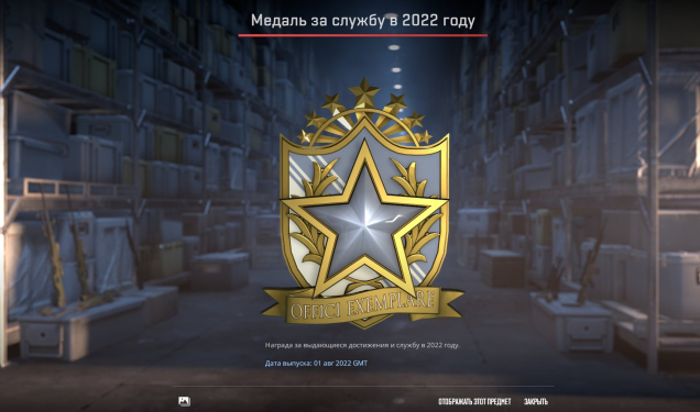 🟢 8 Медалей: 1) Медаль Global Offensive 2) Монета за 5 лет службы 3) Монета десятилетнего юбилея 4) Медаль первого премьер-сезона 5) Медаль за службу в 2021 году 6) Медаль за службу в 2022 году 7) Медаль за службу в 2023 году 8) Медаль за службу в 2025 году