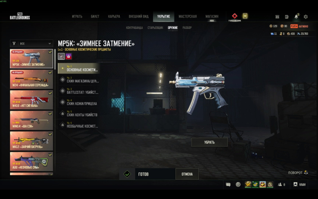 прокачиваемые оружия M416-6 lvl, AUG -6 lvl. MINI14 -6 lvl, MK12- 6 lvl. M24 -1lvl MP5K -1lvl SLR-1lvl