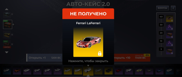 💎 Эксклюзивность гарантирована: получить Ferrari LaFerrari можно только открыв 40 авто-кейсов 2.0, потратив 48.000 BC. Не упусти шанс стать владельцем легенды!