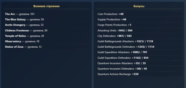 Подробное описание: Миры: 1, Эпоха: Расцвет Средневековья, Рейтинг: 1 650, Бриллианты: 2 650, Монеты: 23 000 000, Ресурсы: 27 000 000, Медали: 2 750 000, Великие строения: The Arc (уровень 101), The Blue Galaxy (уровень 58), Arctic Orangery (уровень 32), Château Frontenac (уровень 30), Temple of Relics (уровень 20), Observatory (уровень 18), Statue of Zeus (уровень 12), Бонусы: Coin Production (+40%, Supply Production (+48%, Forge Points Production (+1%, Attacking Units (+945/384%, City Defenders (+981/583%, Guild Battlegrounds Attackers (+1521/1119%, Guild Battlegrounds Defenders (+1243/1114%, Guild Expedition Attackers (+1085/797%, Guild Expedition Defenders (+1142/934%, Quantum Incursion Attackers (+35/35%, Quantum Incursion Defenders (+30/45%, Quantum Actions Recharge (+550%