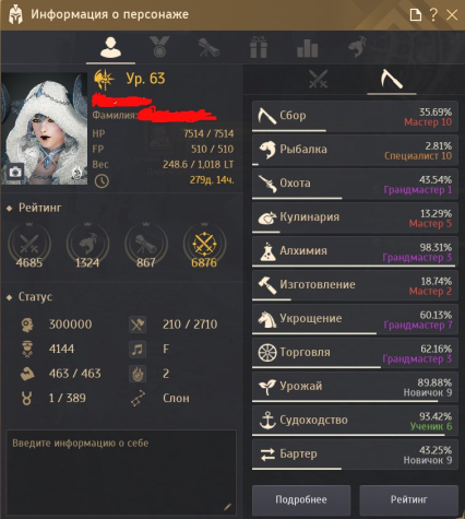 Имеется неплохо прокаченное ремесло где акцент делался на коневодство, в банке 15 курильниц грёз на крафт еще 2х коней т10. Свой конь пепега т10 в крогдалоре земля +7 ускоренный пёрышками, Т9 дум и Т9 пепега. Имеется лесная повозка с фул шмотом +8! 53 рыжих раба, все стоят на узлах и сносят всё на склад Хиделя. Связана фул карта по узлам (кроме Камы), связка проходит от Чаши Мудрецов, Оделиту, Двенкрун, Деревню Эил, и выходят в основную связку через Хидель-Кальфеон-Альтинова-Валенсия. И сверху присоединил Страну утра. Для торговли самое то! Раз в месяц сделать паков и халявные 5-10 лярдов в кармане. На аккаунте 16 персов, 1 ремесленник 49лвла, остальные 61-63 лвла. На ниндзе куплены фул вес 3.1к и фул слоты инвентаря. Имеются самые долго-выбиваемые части компаса с гистрии, осталось выбить самую простую с анакреона и можно делать компас. Так же имеется стул маноса V, аквариум 100 слотов и рюкзак пафу на рыбалку.