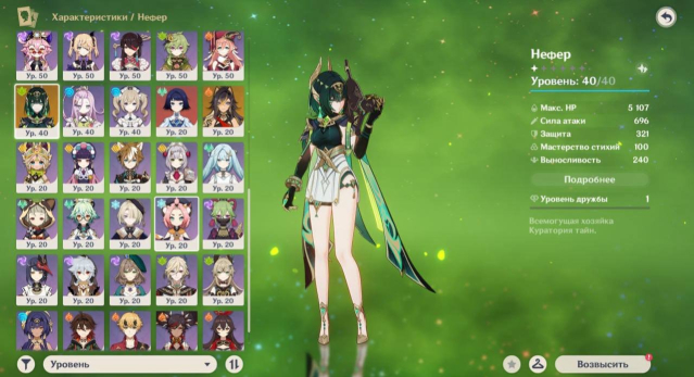 Сян Лин (С3), Розария (С2), Лайла(С0), Чун Юнь(С5), Яо Яо(С4), Хэйдзо (С1), Нин Гуан(С6), Линетт (С4), Кэйа(С0), Дори(С5), Фишль (С5), Бэй Доу(С3), Янь Фэй(С2), Барбара (С3), Качина (С2), Юнь Цзинь(С6), Горо(С1), Ноэлль (С3), Фарузан (С1), Саю(С2), Сахароза (С0), Фремине (С6), Диона (С1), Синобу (С3), Сара(С6), Рэйзор(С5), Лиза(С0), Кавэх(С0), Коллеи(С6), Кирара(С2), Кандакия(С0), Ка Мин(С2), Тома(С2), Синь Янь(С3), Эмбер (С0)