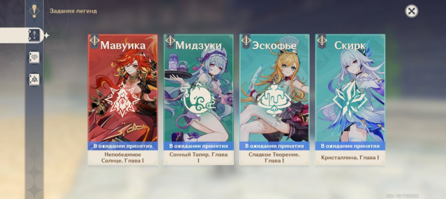 5*: оружие ивент: сигна еимии, сигна аяки, сигна итто, 2 аквы, сигна гань юнь, сигна муалани, все остальные стандартные 5*