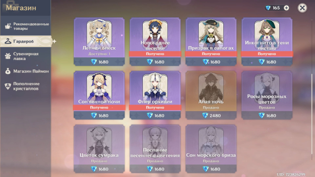 Есть скины на 4* персонажей и платные скины на: Дилюка, Шэнь Хэ, Гань Юй, Аяку и Джинн. Так же на аккаунте имеется 165 кристаллов сотворения;