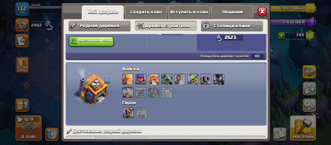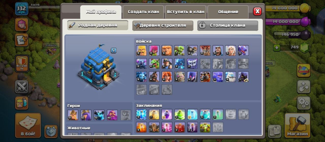 Уровень Ратуши: 12Краткое описание: 🕍【12 ТХ】🏡【7 БХ】🏆【132 LVL】🎭【СКИНЫ НА ГЕРОЕВ】🔮【ИЗОБИЛИЕ РЕСУРСОВ】🔐【СМЕНА ПОЧТЫ】