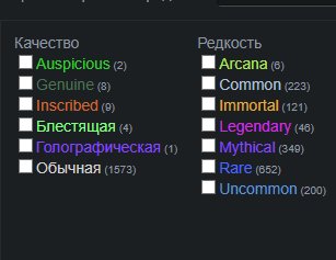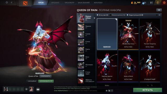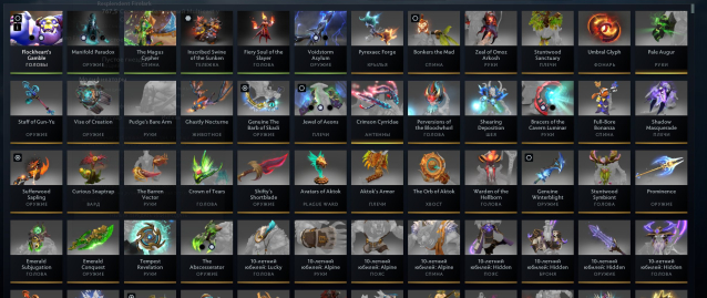 Редкие сеты, включая сет для Бабки, почти все сеты доступные для Белки, плечи для Void и множество насмешек.
