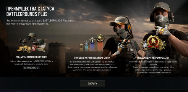 Куплен до перехода на бесплатную модель, что дает постоянную подписку Battlegrounds PLUS с эксклюзивными бонусами и бесплатными G-Coin.