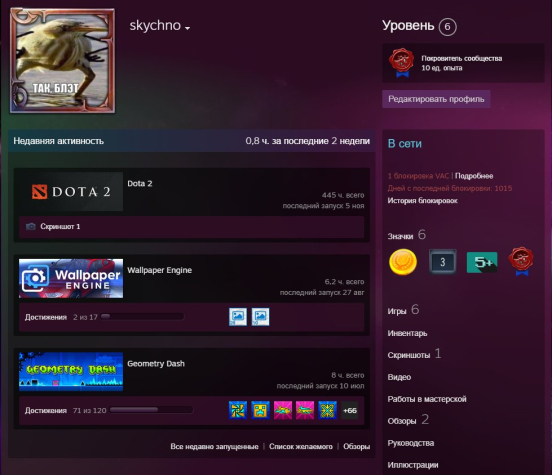 Подробное описание: Идет срочная продажа аккаунта, с перепривязкой почты, открыт рейтинг в доте, раст 370ч, дота 440ч. Так же волпейпер энджин, террария, геометри деш и дст. ОТлычный аккаунт. Единственный минус это вак-бан в КС2 (на аккаунте есть прайм, однако с вак баном) СРОЧНО ПРОДАМ ПО ЛОУ ПРАЙСУ.